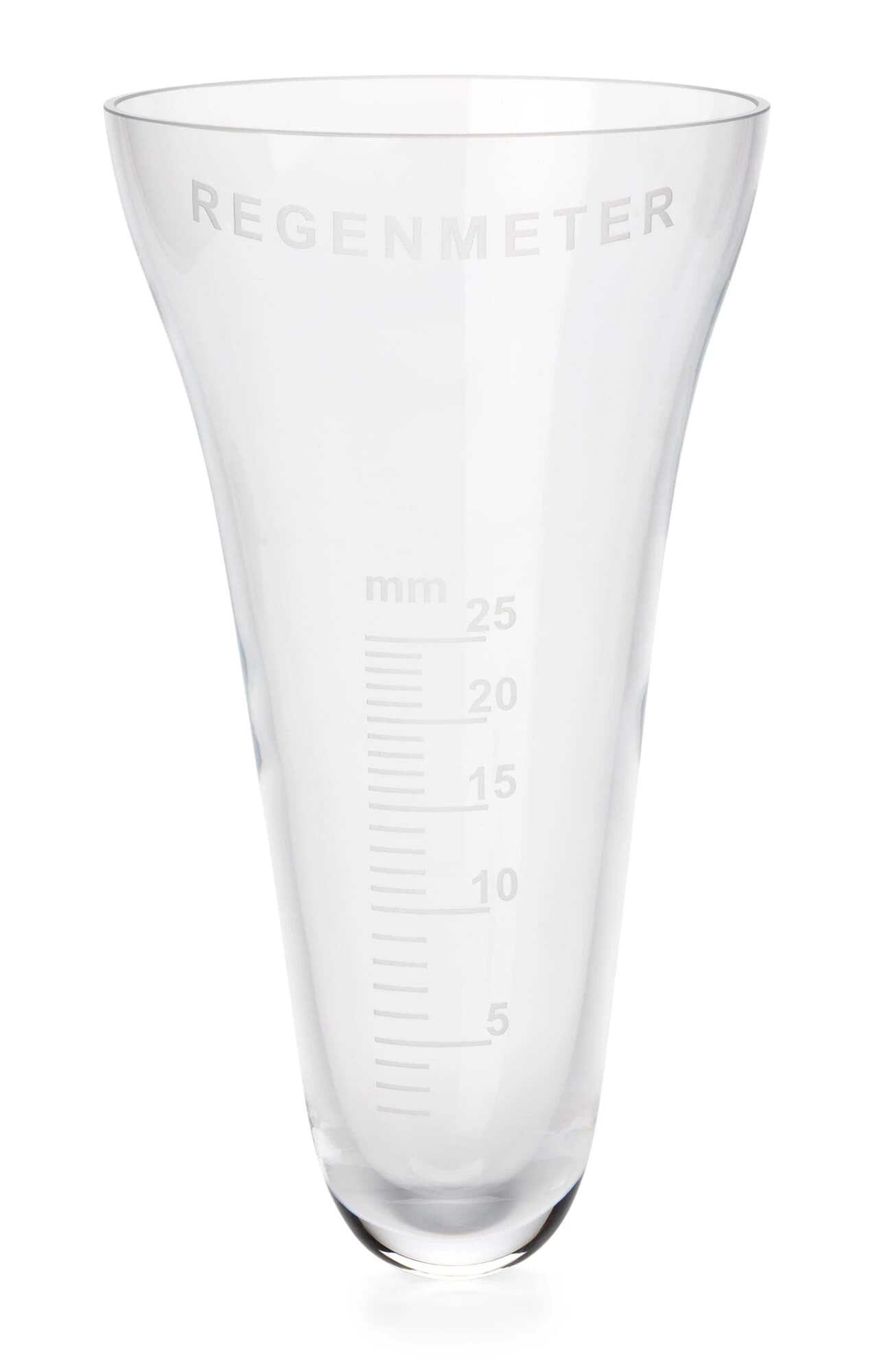 Een van de eigenschappen van glas is dat het kan breken. Als u dit overkomt met de kelk van uw regenmeter – deze kelk gaat dus bij wijze van spreken (niet) aan u voorbij – bieden wij u op dit punt een vervanging aan. De trechtervormige glazen bokaal zoals hij gemaakt is voor onze regenmeter: met de bijbehorende markeringen (zoals op het origineel).