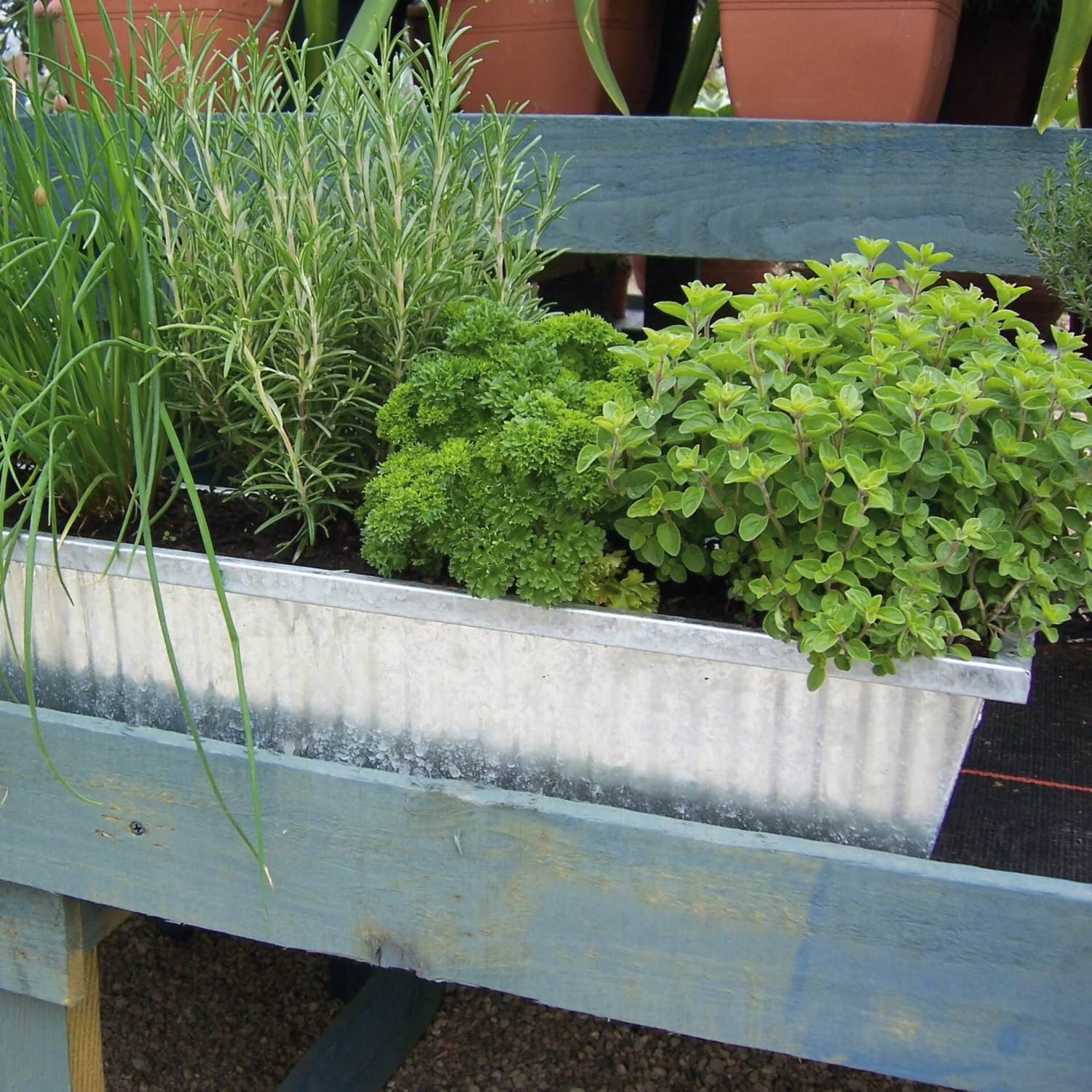 Een balkonbox van plaatstaal die duurzamer is en mooier om te zien dan de gebruikelijke plastic boxen. Het verticale profiel maakt het bijzonder stabiel tegen zijdelingse verdraaiing.