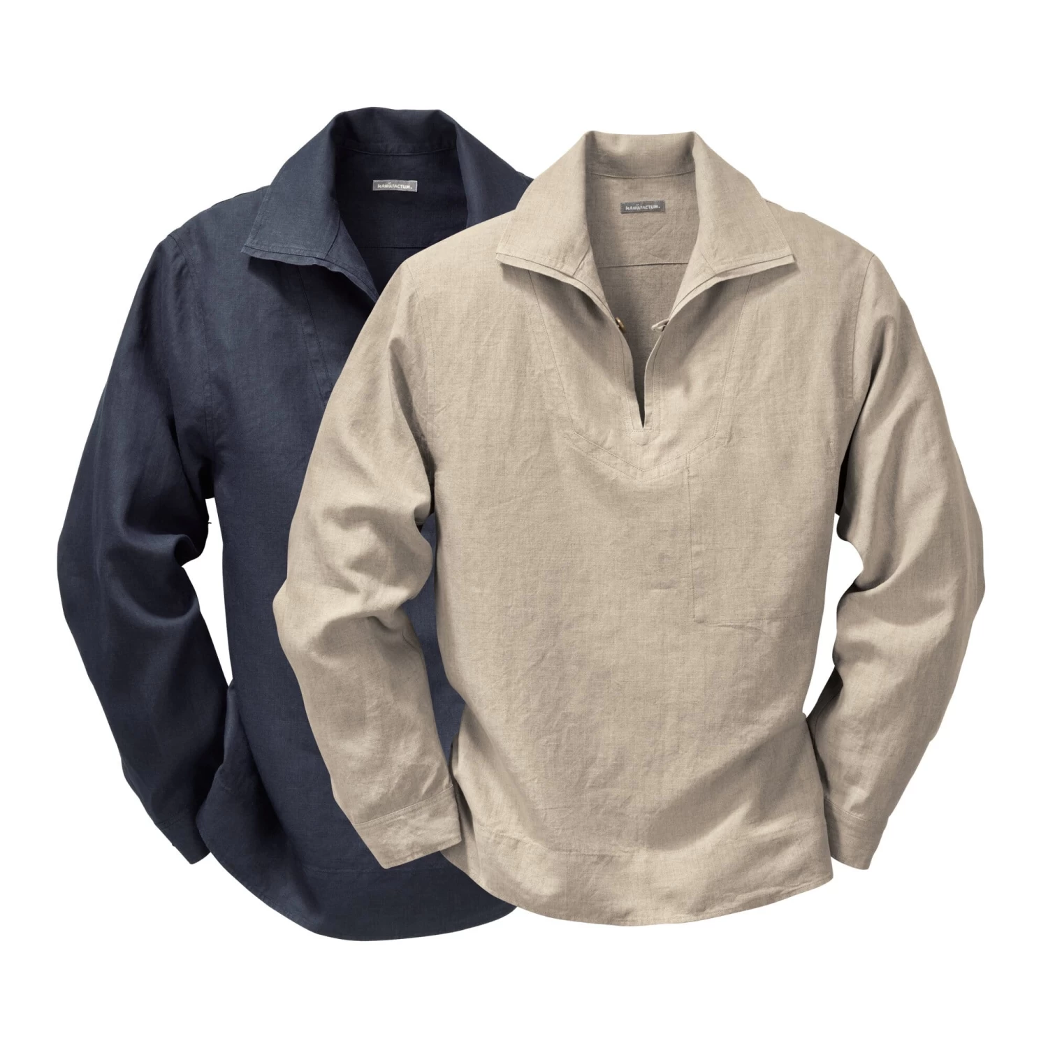 Dit originele vissershemd in de vorm van een klassieke vareuse, wat letterlijk overhemdblouse betekent, is uiterst eenvoudig van vorm – met een inzetstuk, een split en een kraag uit één stuk die omgeslagen kan worden. Om te voorkomen dat ze ergens op het werk worden betrapt, hebben vissershemden traditioneel geen uitstekende knopen. Daar hebben we ons aan gehouden: De enkele knoop die de split bij de hals sluit, zit samen met een lusje aan de binnenkant, en ook de borstzak zit aan de binnenkant. Vroeger werd zo’n hemd gesneden uit restjes canvas, wat naar hedendaagse maatstaven onredelijk zwaar zou zijn. Ons vissershemd is gemaakt van linnen van een kwaliteit die nog ongewoon zwaar is voor hemden.