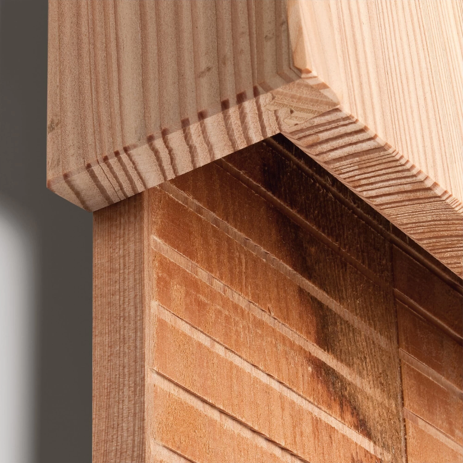 De vleermuizen, die bij voorkeur dicht bij nederzettingen leven, zijn onopvallende maar efficiënte insectendoders: één vleermuis kan per zomer 1 kg vliegen, muggen en knutten doden. Maar de natuurlijke rustplaatsen voor de dieren (in muurscheuren) zijn zeldzaam geworden. Deze lattenkast van larikshout biedt een vervanging: de verlengde achterwand biedt voldoende ruimte voor naderende vleermuizen; hij is ruw gezaagd en heeft ingefreesde groeven – de vleermuizen kunnen zich daar gemakkelijk aan vastklampen en houvast vinden. Alle verbindingen zijn zorgvuldig gelijmd, omdat de dieren niet goed tegen tocht kunnen. De vorm van de houten kist, die naar boven toe taps toeloopt, komt overeen met hun voorkeur voor buik- en rugcontact; de dieren kunnen zelf de optimale breedte van de spleet ontdekken.