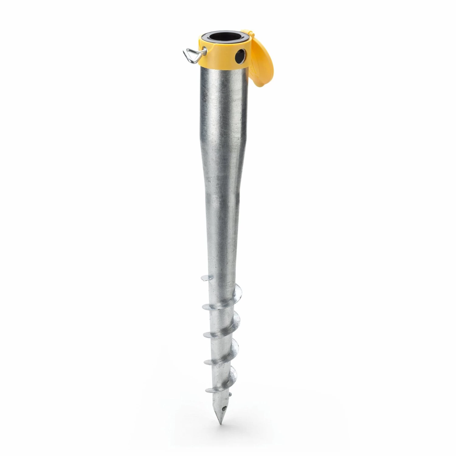 Of het nu gaat om een parasol, vlaggenmast of droogmolen: dit grondanker zorgt voor een stevig houvast. Het wordt in de grond geschroefd met behulp van een staaf, waarvan de binnendiameter kan worden gevarieerd van 2,5 tot 5,7 cm door middel van afstandhouders. Wanneer het grondanker diep genoeg is ingeschroefd, zit het de grasmaaiers niet in de weg; aan het eind van het seizoen kan het weer uit de grond worden geschroefd.