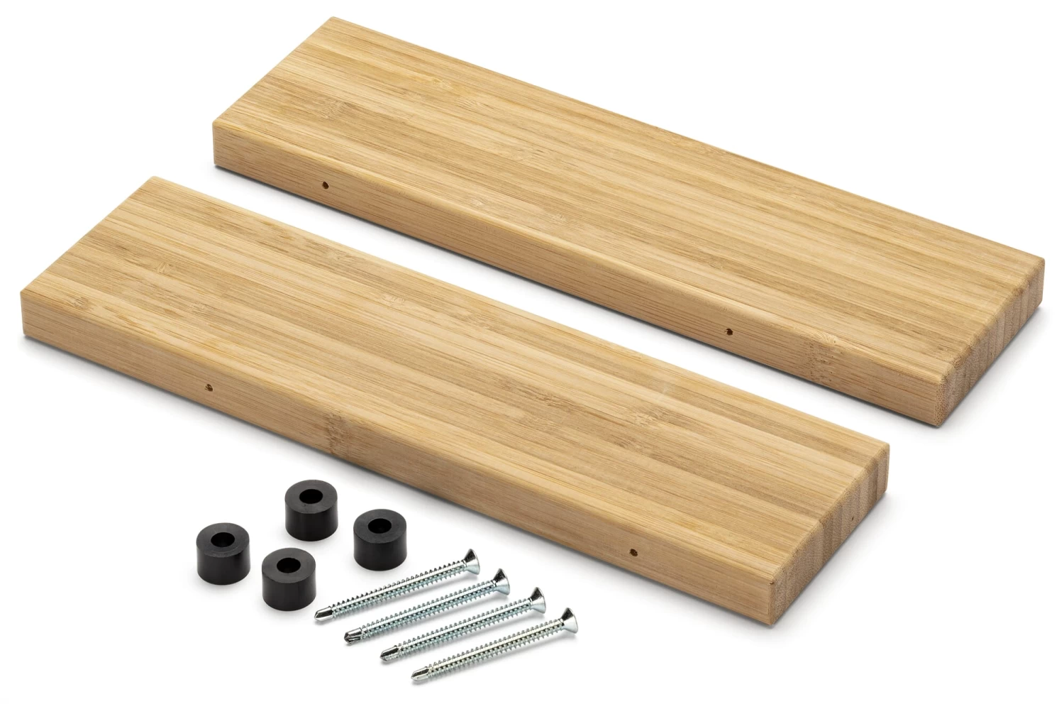 Bamboe geïmpregneerd. Lengte 26 cm, breedte 7 cm, hoogte 2 cm. Totaal gewicht 450 g. Met bevestigingsmateriaal